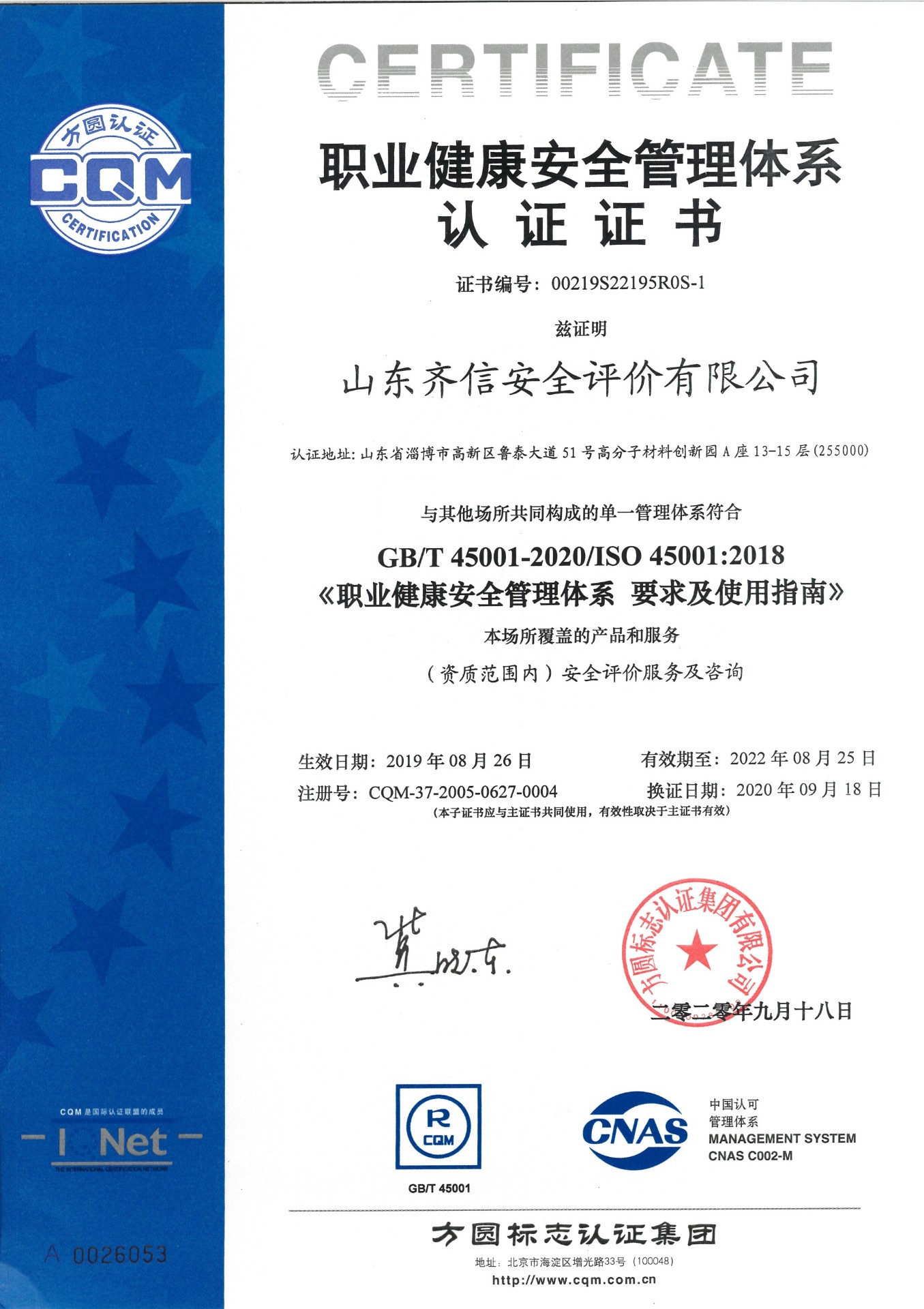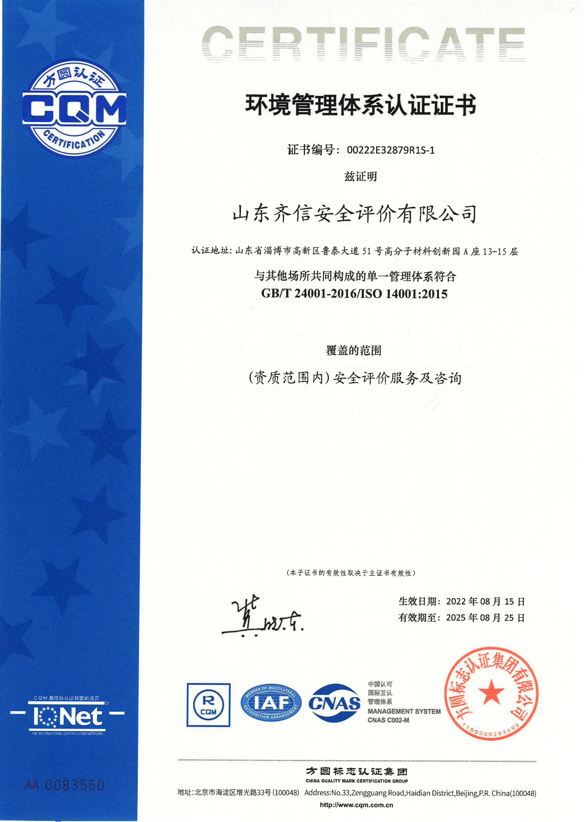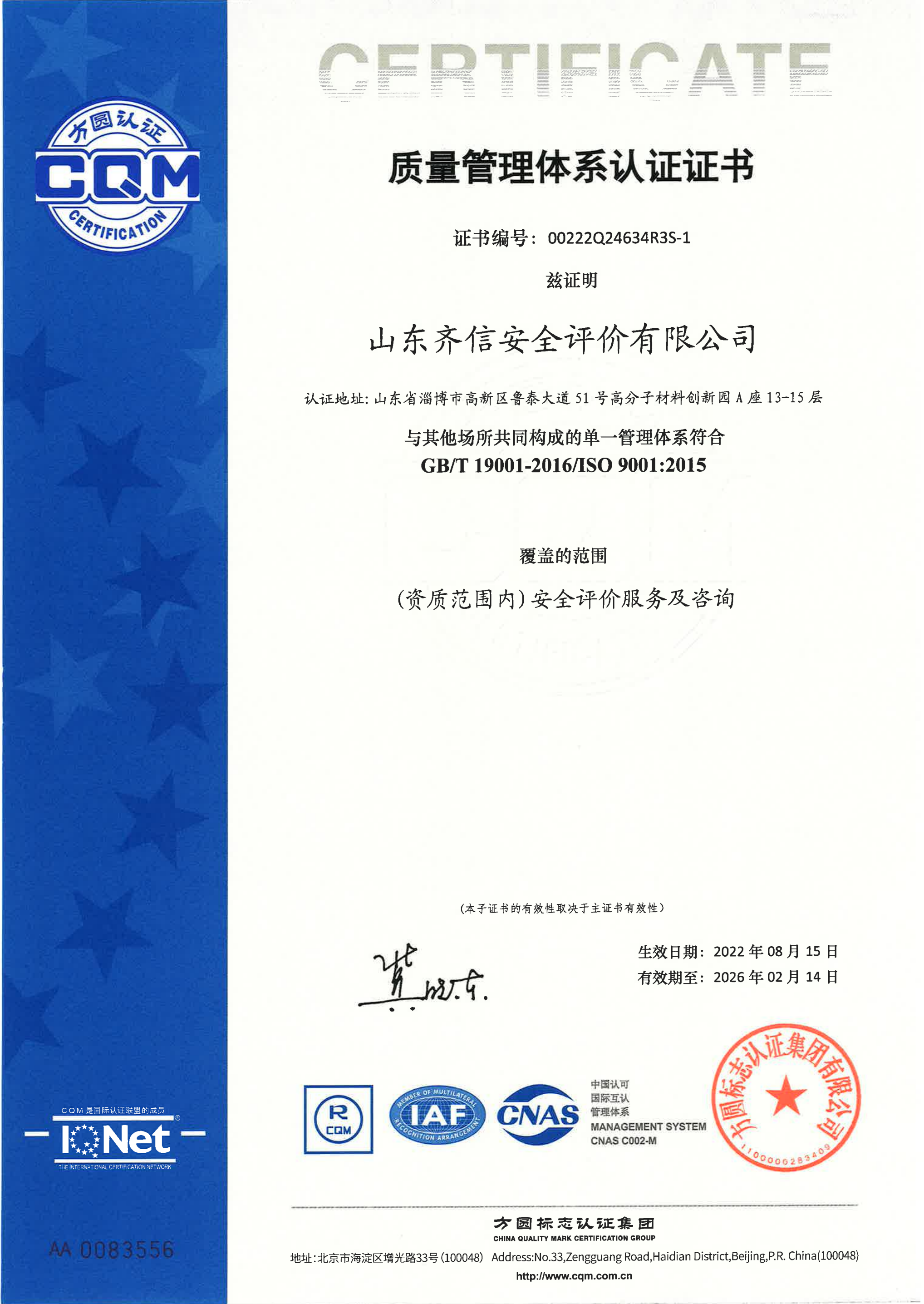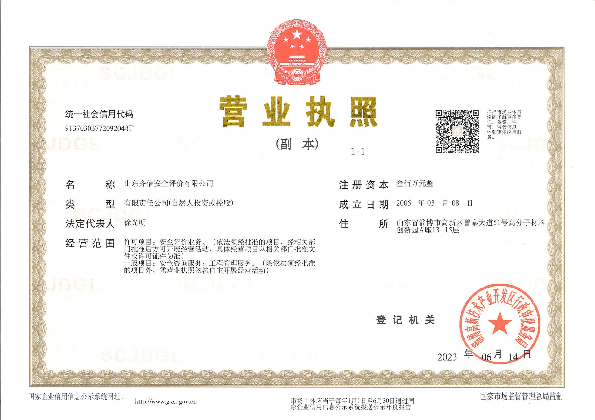 山東齊信安全評價有限公司成立于2005年3月,注冊資本300萬元人民幣,固定資產總值804.8728萬元。法定代表人徐光明,注冊地址及辦公地址位于淄博高新區(qū)魯泰大道51號高分子材料創(chuàng)新園A座13-15樓。2005年9月取得安全評價機構乙級資質。自國家應急部1號令實施以來,公司于2020年1月15日取得新安全評價資質,業(yè)務范圍包括:陸上油氣管道運輸業(yè);石油加工業(yè),化學原料、化學品及醫(yī)藥制造業(yè);金屬冶煉。2018年12月21日取得安全生產標準化二級評審單位,評審范圍:危險化學品、紡織、建材、輕工、冶金、機械。 公司現(xiàn)有人員41人,其中專職安全評價師37人,注冊安全工程師26人,研究員1人、碩士5人、雙學士1人,山東省安全專家?guī)鞂<?人、教授級高工1人,高級工程師8人、工程師22人,專職危險化學品標準化評審員、工商貿標準化評審員30人,本科以上學